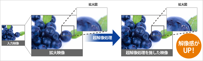 液晶ディスプレイには、解像度の低い映像の解像感を高め、大きい画面でも輪郭をくっきりと表示する超解像機能があります。