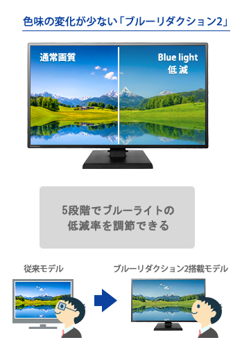 明暗差を抑え、長時間パソコンで作業する上での目の負担を軽減する機能です。