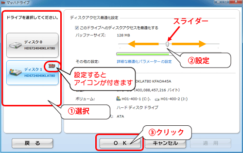 設定するドライブを選択し、バッファーサイズをスライダーで設定して、[OKボタン]をクリックします。 |
