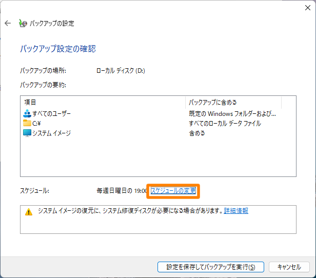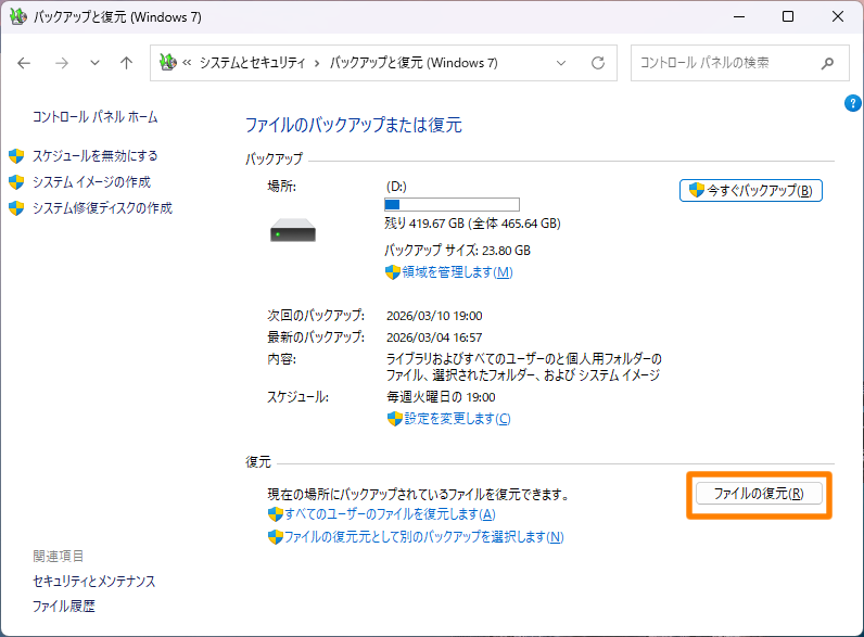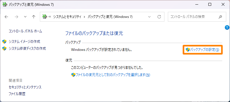 Windows標準の「バックアップと復元」を使用してバックアップ設定(スケジュールバックアップ)や復元(ベアメタル回復)ができます。