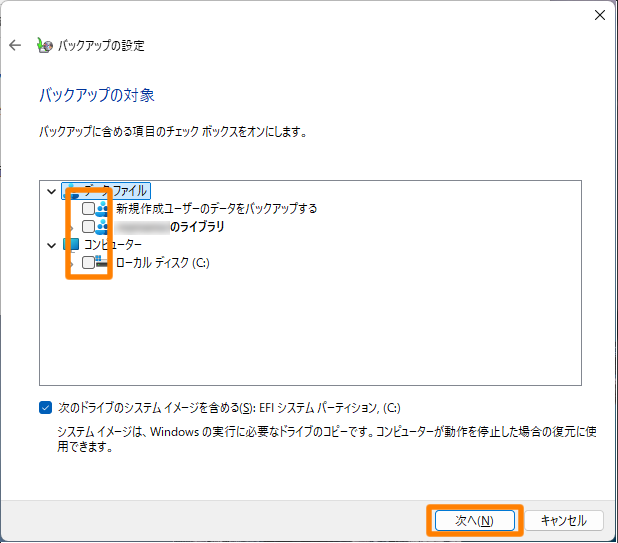- バックアップするデータにチェックをつける