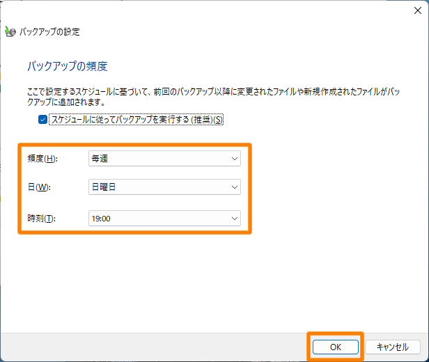 ※ スケジュール設定しない場合は、[スケジュールに従ってバックアップを実行する]のチェックを外します。 - [OK]をクリック