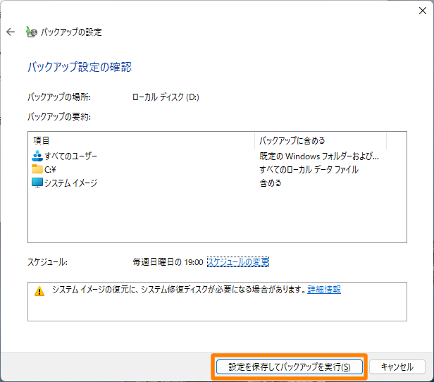 内容を確認し、[設定を保存してバックアップ]をクリック
