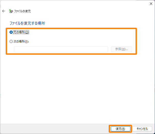 - 復元する場所を指定