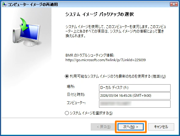 バックアップ設定時に、システムイメージを含めたバックアップをおこなっている場合は、以下の方法でベアメタル回復が実行できます。