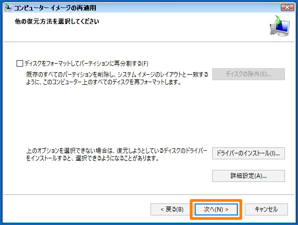 ※ リカバリープログラムがドライブ C: に Windows システムを発見した場合、[続行]と表示されます。[続行]をクリックすると、リカバリープログラムを終了して、Windowsを起動します。「詳細オプション」で、[イメージでシステムを回復]をクリック