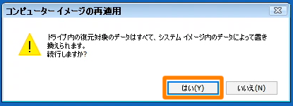復元処理を開始します。リカバリーUSBメモリーを抜いてください。復元後は自動的に再起動します。warning注意ご注意[はい]をクリックすると、現在のディスク内容はすべて消去され、バックアップされていたイメージに置き換わります。