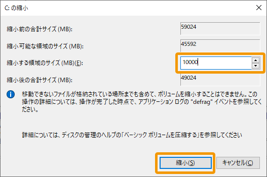 Dドライブに用意する容量分だけ「縮小する領域のサイズ」に入力し、[縮小]をクリック