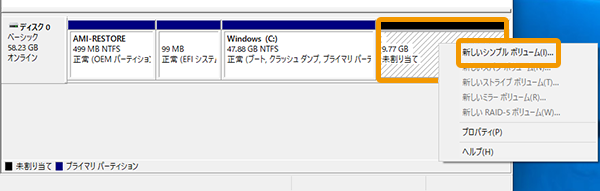 ※ Dドライブは最低でも2GBはご用意ください。未割り当ての領域を右クリックし、[新しいシンプルボリューム]をクリック