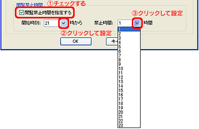 チェックすると、パソコンの利用制限がおこなわれている時間帯に、指定したメッセージを表示します。(1〜200文字)