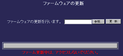 [ファームウェアの更新]の[参照]ボタンをクリックして、ファームウェアファイルの場所を指定します。 ファイルを指定後、[更新]ボタンをクリックします。更新を開始します。 更新中は、絶対に本製品の電源を切らないでください。故障の原因となります。