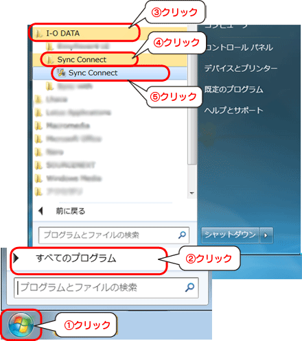 [スタート]→「すべてのプログラム」([プログラム])→[I-O DATA]→[Sync Connect]→[Sync Connect]を順にクリックします。 |