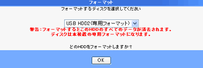 FATやNTFSディスクも選択できますが、フォーマットすると本製品専用フォーマットとなります。FATやNTFSフォーマットはWindowsにて行ってください。(方法については、ハードディスクの取扱説明書をご覧ください。)