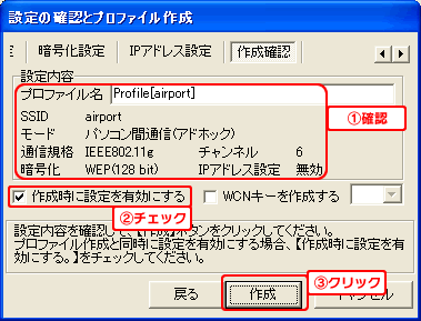 設定内容を確認し、[作成時に設定を有効にする]にチェックを付けて、[作成]ボタンをクリックします。