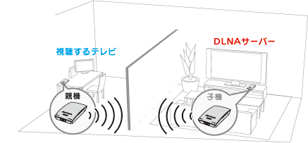 <例2> ※親機と子機を<例1>のように入れ替えが可能な場合、設置し直していただければ、 あらかじめテレビ等にDLNAサーバーを登録する必要がありません。