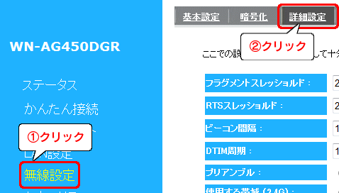 本製品は初期設定で20MHzでの動作となります。 40MHzでの動作へ変更することで 5GHzは最大450Mbps、2.4GHzは最大300Mbpsでの使用が可能となります。 40MHzでの動作に変更する場合は、以下の手順にしたがって設定をしてください。