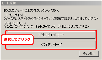 上記の画面で[キャンセル]をクリックすると、[クライアントモード](出荷時設定)になります。 |