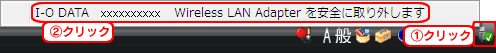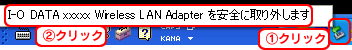 画面右下のタスクトレイのハードウェアの安全な取り外しアイコンをクリックし、表示された[802.11 n WLAN]または[I-O DATA xxxxxx…]をクリックします。