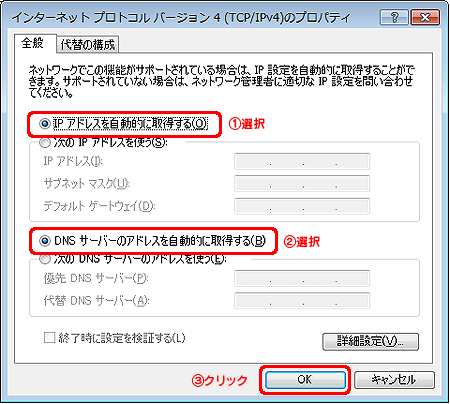 (7) [IPアドレスを自動的に取得する]と[DNSサーバーのアドレスを自動的に取得する]にチェックして、[OK]ボタンをクリックします。