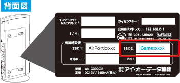 ニンテンドーDSi/DS Lite/DSの場合は、[Gamexxxxx](xxxxxは機器により異なる)を選択します。 ※WEPでの暗号化がされているSSID(SSID2)を選択します。 ※SSIDの出荷時設定は本製品貼付のシールに記載されています。 ニンテンドーDSi/DS Lite/DS以外の場合は、[AirPortxxxxx](xxxxxは機器により異なる)を選択します。