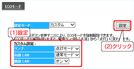 手順2で[カスタム]を選択した場合は、[ランプ]、[有線LAN]、[無線LAN]の設定をし、[設定]ボタンをクリックします。