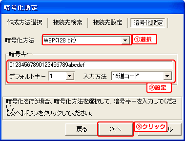 WEPで送信するキーを選択します。通常はWEPキー1を使用します。選択したキーを使用して送信データを暗号化します。 |