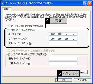 5. [ローカルエリア接続]または[ワイヤレスネットワーク接続]のプロパティ画面に戻りますので、[OK]ボタンをクリックします。