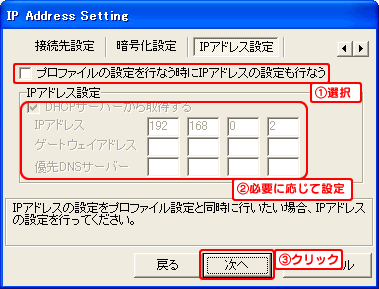 IPアドレスの設定を行う場合は、[プロファイルの設定を…]のチェックを付けて、IPアドレスの設定をします。