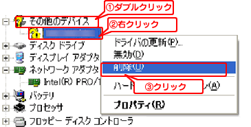 [!I-O DATA xxxxx Wireless LAN Adapter] または [? xxxxx]などと誤認識されたドライバをクリックし、選択されていることを確認した後、右クリックし、表示されたメニューから[削除]をクリックしてください。あとは画面の指示にしたがって削除します。