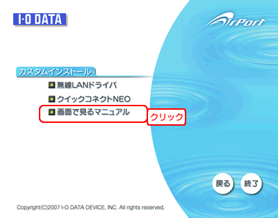 メニューが表示されたら、[カスタムインストール]→[画面で見るマニュアル]をクリックします。 メニューが表示されない場合は、[マイコンピュータ]を開き、CD-ROM(無線LANアダプターのサポートソフト)をダブルクリックします。
