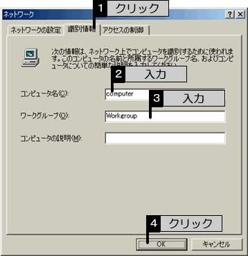 [識別情報]タブをクリックして、[コンピュータ名]と[ワークグループ]に以下を入力し、[OK]ボタンをクリックしてください。