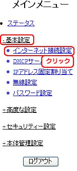 設定画面の[基本設定]→[インターネット接続設定]をクリックします。