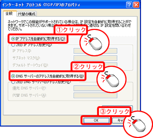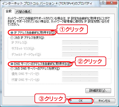 [IPアドレスを自動的に取得する]をチェックし、[DNSサーバーのアドレスを自動的に取得する]をチェック後、[OK]ボタンをクリックします。