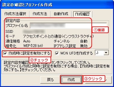 設定内容を確認し、[作成時に設定を有効にする]にチェックを付けて、[作成]ボタンをクリックします。