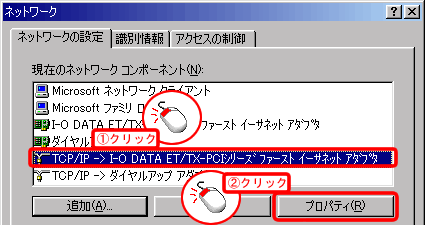 [TCP/IP](あるいは[TCP/IP -> xxxxxxx])をクリックし、[プロパティ]ボタンをクリックします。
