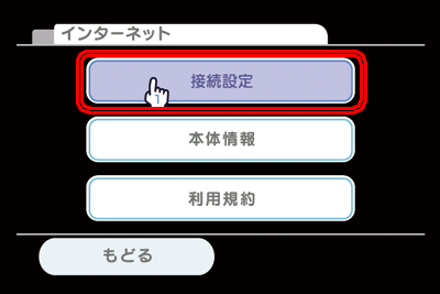 [インターネット]画面が表示されますので、[接続設定]にカーソルを合わせ、[A]ボタンを押します。 |
