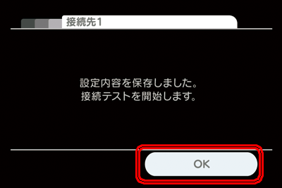 「設定内容を保存しました。接続 テストを開始します。」と表示されたら、[OK]にカーソルを合わせ、[A]ボタンを押します。