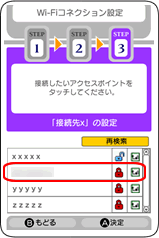 ステップ1の4で入力したSSIDをタッチします。 ※見つからない場合は、[再検索]をタッチします。