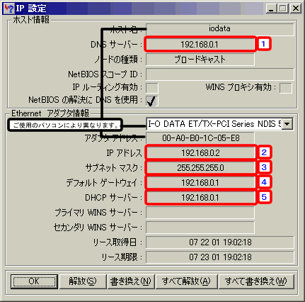 本製品から割り当てられたパソコンのDHCPサーバー値(本製品のIPアドレスです。) |