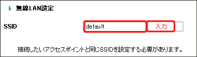 無線LAN設定で、アクセスポイントに設定してあるSSIDと同じ[SSID]を入力します。