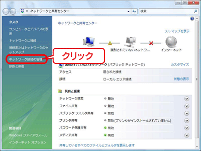 [スタート]→[コントロールパネル]→[ネットワークの状態とタスクの表示]をクリックします。