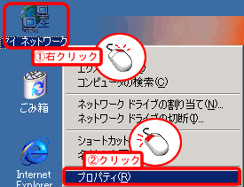 [ローカルエリア接続(もしくは、[ワイヤレスネットワーク接続])を右クリックし、[プロパティ]をクリックします。