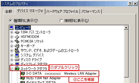 [ネットワークアダプタ]の下に[I-O DATA xxxxx Wireless LAN Adapter]と表示されていることを確認します。その頭に[!]マークが表示されていないことも確認します。確認できたら[OK]ボタンをクリックして画面を閉じます。