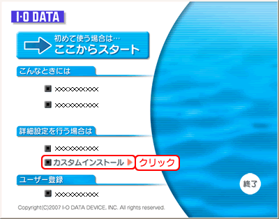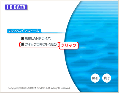 メニューが表示されたら、[カスタムインストール]→[クイックコネクトNEO]をクリックします。 メニューが表示されない場合は、[マイコンピュータ]を開き、CD-ROM(無線LANアダプターのサポートソフト)をダブルクリックします。