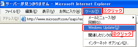 InternetExplorerを起動し、[ツール]→「WindowsUpdate」をクリックします。 ⇒Microsoft社のホームページが開きます。