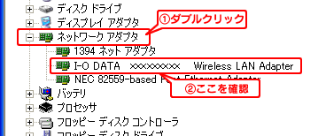 [ネットワークアダプタ]の下に[I-O DATA xxxxx Wireless LAN Adapter]と表示されていることを確認します。その頭に[!]マークが表示されていないことも確認します。確認できたら画面を閉じます。