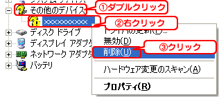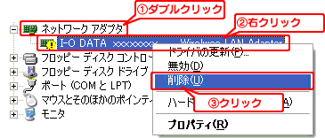 [!I-O DATA xxxxx Wireless LAN Adapter] または [? xxxxx]などと誤認識されたドライバをクリックし、選択されていることを確認した後、右クリックし、表示されたメニューから[削除]をクリックしてください。あとは画面の指示にしたがって削除します。