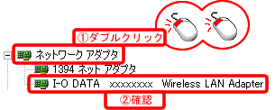 [ネットワークアダプタ]の下に[I-O DATA xxxxxxxx Wireless LAN Adapter]と表示されていることを確認します。