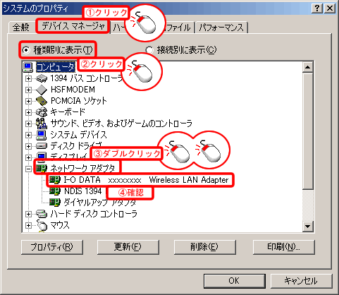 [デバイスマネージャ]タブをクリックして、[種類別に表示]で、[ネットワークアダプタ]をダブルクリックします。