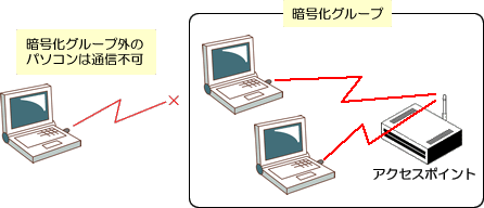 無線LANアダプターでは、無線LANの暗号化の標準である以下での暗号化を行うことによって、通信の傍受の危険を回避することができます。